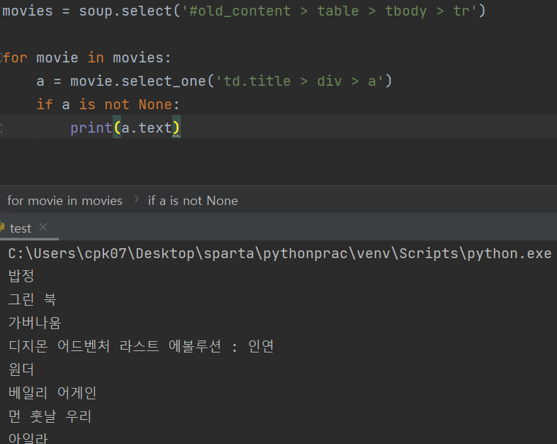 해당 html요소가 출력되었다. 여기서 영화제목만 출력해보겠다. 일단 select_one의 리턴값을 title이라는 변수에 넣어주고 출력해보겠다.