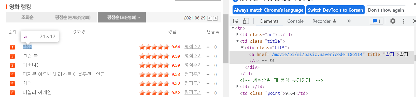 우선 아무 영화제목에 커서를 두고(난 랭킹1위로 했음) 오른쪽 클릭을 하고 '검사'를 누르면 개발자도구 창이 나오면서 해당 영화제목의 html요소가 바로 나옴.