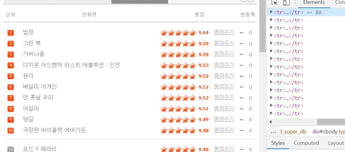 '순위,영화명,평점,변동쪽' 이 한 줄이 tr 한줄의 내용이다. 저 줄들의 html요소들이 리스트에 담겨 출력된 것이다.