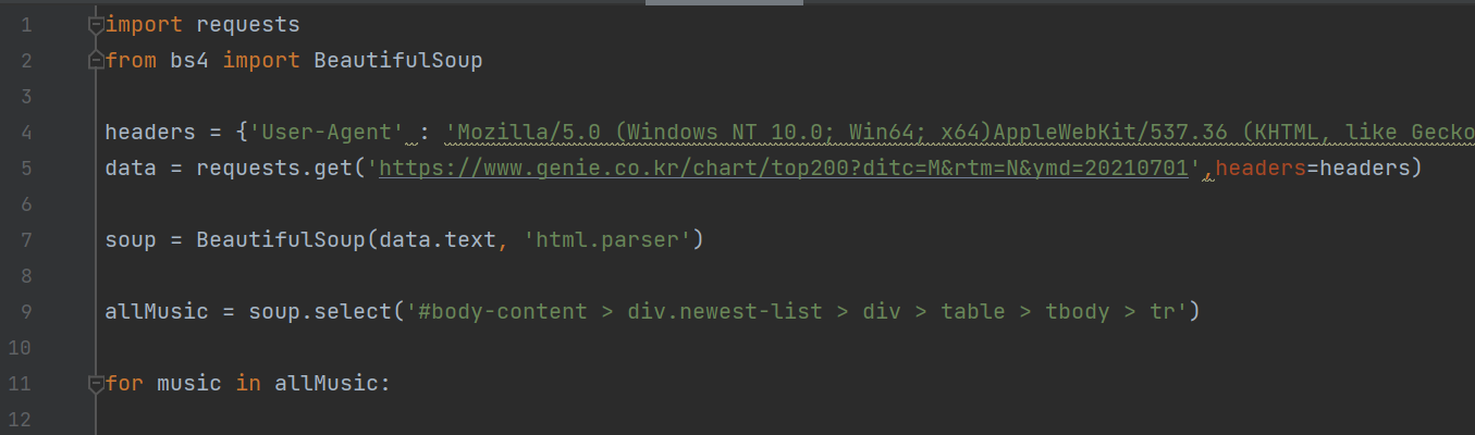 긁어온 데이터는 'allMusic'에 담고 for문을 돌리려고함. 하지만 여기서 문제가 발생.