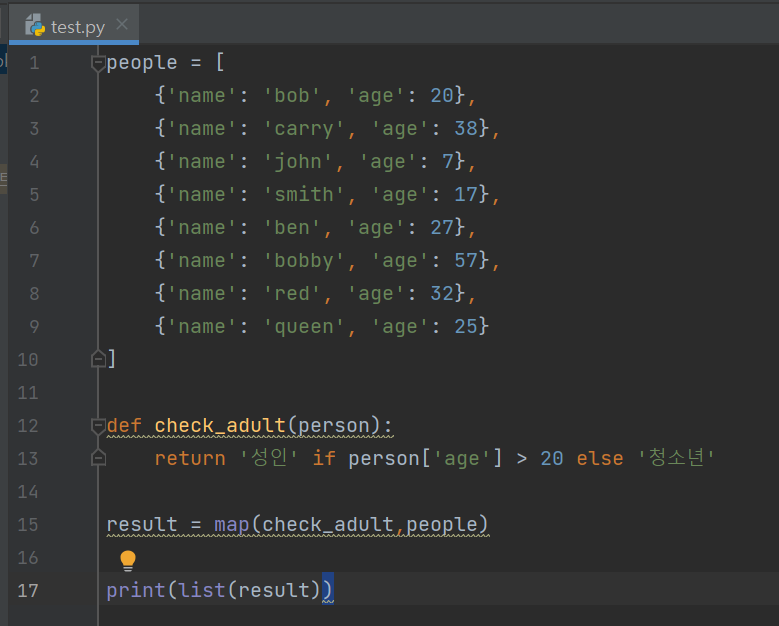 위 예시 print(list(result)) 이렇게 작성하지않고, list(map(check_adult,people)) 라고해도 좋다.